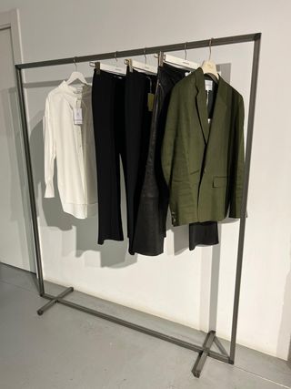 Burrito para almacenaje de ropa colgada. Material: hierro forjado. Color: imprimación y pintura tipo ferro mate. Características: gran resistencia, compacto, fácil conservación y limpieza, encargo para varias tiendas, boutiques y córners de El Corte Inglés. Dimensiones: 1,50m (largo) x 0,15m (ancho patas/soporte) x 1,70m (alto). Estado: nuevo a estrenar. Otros: se disponen de varias unidades (a consultar).