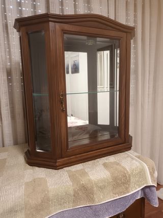 Armario clásico de madera con puertas de cristal. - Diseño elegante y atemporal. - Acabado en tono madera natural. - Estantes de cristal para exhibición.