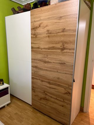 Armario espacioso con un diseño moderno y funcional. - Paneles de madera clara. - Ideal para organizar ropa y accesorios. - Dos puertas correderas. - En un lado del armario baldas y en otro para colgar las perchas. - De gran capacidad. Quien quiera comparlo tendrá que venir a desmontarlo y así poder llevarselo.