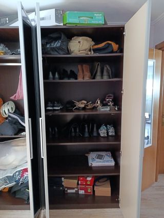 Armario tamaño 150x64x 238. Madera y cristal. Usado menos de un año y guardado desmontado en trastero por cambio de vivienda. Parte izquierda con colgador, baldas y una abajo para zapatos. Parte derecha colgador, cajones y balda baja para zapatos. Costó más de 700€ (se envía comprobante de factura).