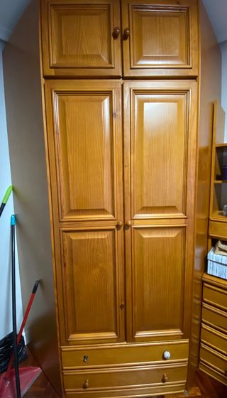 Precioso armario ropero de madera maciza, de color marrón. Se compone de dos cuerpos. - Dispone de espacio para colgar ropa. - Incluye cajones en la parte inferior. - Diseño clásico y elegante. se recoge en Santander a partir del 15 de Agosto