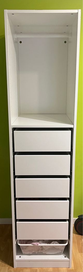 Armario de la serie PAX de Ikea en color blanco. Ideal para organizar tu ropa y accesorios. - Estructura de madera. - Incluye barra para colgar. - Dispone de 5 cajones y un cesto. - Diseño moderno y funcional. En las fotos salen los defectos. Precio nuevo: 223€