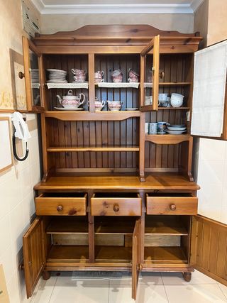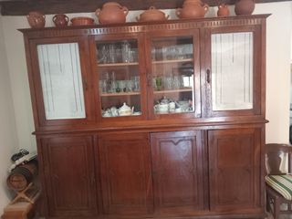 Precioso armario de comedor con más de 120 años de antigüedad. Una pieza única para tu hogar. - Fabricado en madera de castaño - Puertas acristaladas con detalles. - Amplio espacio de almacenamiento.