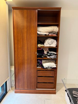 Armario de madera maciza en color marrón. Está en buen estado y listo para usar. - Dos puertas. - Dos cajones - Barra para colgar ropa. - Estantes interiores. Hay que venir a por el a recogerlo.