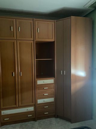 Muebles de madera que incluye: -Armario principal de 3 puertas, dividido en 2. Con cajoneras dobles. -1 mesita de 3 cajones. -2 cabeceros y dos piezeros de 1.05. -Sinfonier - Acabado en madera de pino de tono cálido.