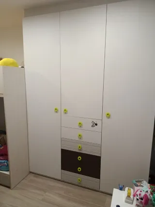Armario infantil con un diseño moderno y divertido. - Puertas blancas con tiradores de plástico verde. - Sección de cajones con detalles decorativos. - Fabricado con materiales resistentes. -Medidas: 237x176x58