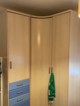 Armario de esquina con un diseño moderno y funcional. Perfecto para organizar tu ropa y accesorios. - Acabado en tonos beige y azul. - Combinación de materiales de madera y plástico. - No se lleva a ningún lado, tiene que venir a por el.