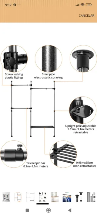 Estructura de armario metálico con detalles en plástico, de tres cuerpos.Es de Amazon - Tubos de acero con pulverización electrostática. - Acoples de plástico con tornillo de bloqueo. - Barra telescópica ajustable de 0.7m a 1.1m. - Poste vertical ajustable de 2.15m a 3.1m. - Estante de 0.95m x 35cm (no retráctil).