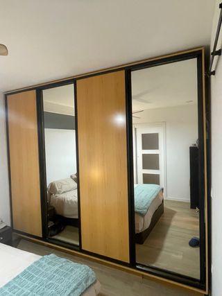 Armario empotrado de madera con cuatro módulos de puertas correderas y un espejo. El primer módulo mide 1'63cm, el segundo 1'55cm, el tercero, el del espejo 1'55cm y el frontal 1'90cn. Las puertas todas miden 74cm, excepto el lateral que son de 66cm. El lateral mide 77cm de ancho. El armario en total mide 4,65cm y el lateral 1'37cm. De alto 2,58cm. Más artículos en mi perfil. Se atiende por WhatsApp 600714533 - Diseño de puertas correderas. - Acabado en tono madera natural.
