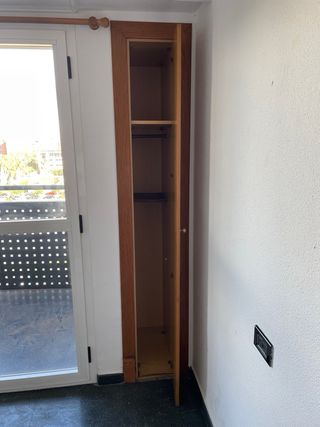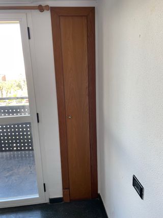 Armario empotrado de madera, ideal para espacios reducidos. - Diseño compacto. - Acabado en tono madera natural. Puerta del armario de ancha 25cm Tapetas de ancho son 8 cm cada lado En total de ancho unos 43 cm Puerta del armario de largo 203cm más la tapeta de arriba de 8cm os lo podéis llevar todo!