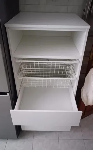 Mueble de almacenaje blanco con un diseño moderno y funcional. - Tres cajones inferiores. - Dos cestas de alambre metálico. - Estante superior abierto. Comprada para el interior de un armario empotrado pero la vendo por mudanza. Muy poco tiempo de uso.