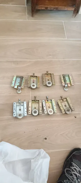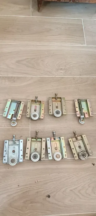 Pack de 8 rodamientos para puertas correderas de armario empotrado. Son piezas metálicas con ruedas de plástico. - Fabricados en metal y plástico. - Color dorado y plateado. Medidas de la parte metálica 7 ancho 9 alto Fondo 2.5