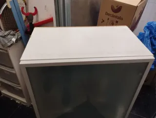 Armario auxiliar con puertas de metacrilato y estructura blanca. - Diseño moderno y funcional. - Ideal para almacenar productos de limpieza o alimentos.Armario despensa con un diseño moderno y funcional. - Paneles de metacrilato - Estructura de metal.armario, estante con vitrina como despensa, escobero , vitrina translúcida. mueble horizontal. Con mucho almacenamiento.