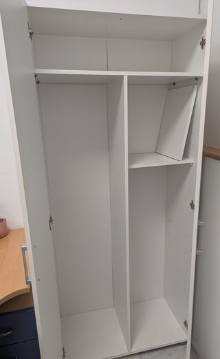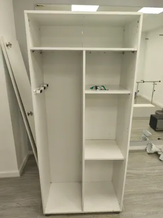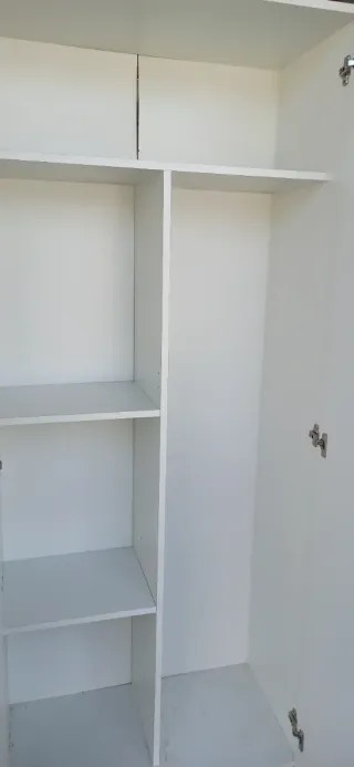 Armario multiusos ya montado, ideal para organizar tu hogar con 2 puertas y 3 estantes. - Medidas: 180 cm (alto) x 73 cm (ancho) x 37.5 cm (profundidad). Incluye 3 estantes y 2 son regulables de altura. - Color blanco mate con tiradores ABS. Se entrega ya montado, al final no nos sirve por medidas. Completamente nuevo estrenado hace 1 mes.