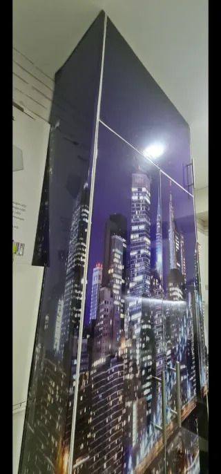 Mueble escobero con un diseño llamativo de una ciudad nocturna. - Puertas con imagen impresa de rascacielos y puente. - Acabado brillante.