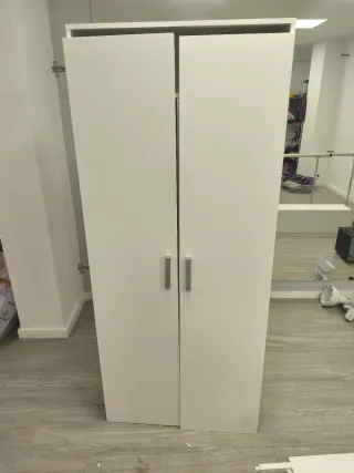 Armario escobero de madera, ideal para organizar tu hogar. Está nuevo. Lo compré en diciembre de 2025, pero es demasiado grande para mi habitación. Su diseño moderno y color blanco se adaptan a cualquier estancia. - Acabado liso y limpio. - Dos puertas con tiradores. - Amplio espacio interior.