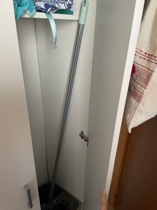 Mueble escobero y útiles de limpieza.