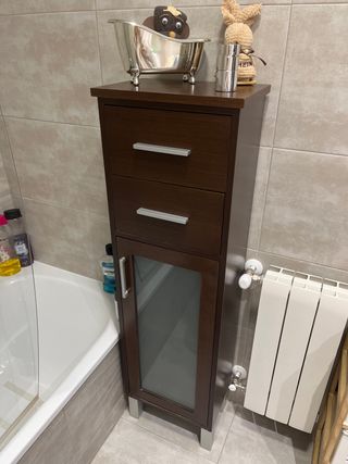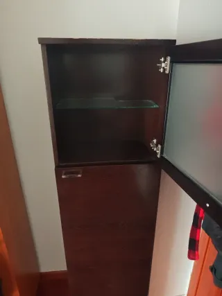 Armario de baño estrecho con un diseño moderno y funcional. Ideal para optimizar el espacio. Con patas - Acabado en madera oscura. - Puerta con panel de cristal. - Tiradores metálicos plateados.