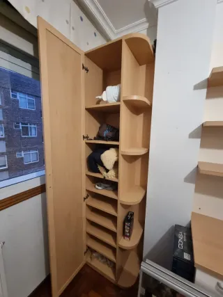 Armario estrecho con un diseño moderno y funcional. Esta nuevo sin usar, pero tiene algun pequeño roce y le falta una sujecion de una de las tablas, como se aprecia en la foto, que no influye en su uso. - Estructura principal de madera. - Barra de colgar metálica. - Estantes interiores de madera. Medidas : Alto : 185 cm Ancho : 41 cm Fondo : 52 cm Se recoge en Murchante