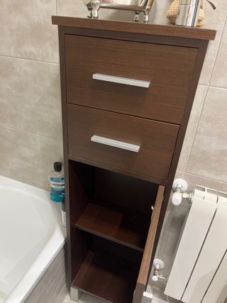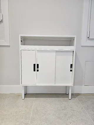 Mueble auxiliar estrecho, con 2 puertas correderas, estantería abierto y baldas ajustables. Material madera de ingeniería. Capacidad de carga hasta 30 km. Tenía ruedas y las cambiamos por patas de metal. Tiene roces por el uso como puede verse en las fotos que se pueden tapar fácilmente con reparador. Ancho 70cm, fondo 20cm y altura 85,5cm.