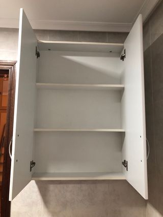 Armario estrecho de color blanco, con muchas baldas. Tiene bisagra para anclarlo a la pared. Tiene algún golpe como se puede ver en las imágenes.
