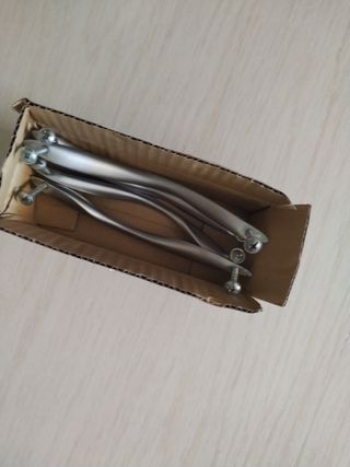 4 Tiradores - agarradores plateados de aluminio de puertas de muebles cocina. Son algo más claros que lo que salen en la foto. Medida estándar de unos 12,8-13 cm de anchura entre tornillos. Los de las 5 primeras fotos son de los armarios blancos. Vendo a 2€ cada uno. Tb tengo de otros 2 modelos diferentes, aunque de la misma medida de los armarios marrones. Son iguales de medida estándar pero más0 estrechos como se ve en las fotos. Echa un ojo en mi perfil y pregunta si tienes dudas de lo que sea.