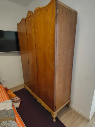 Armario de madera de estilo vintage y gran tamaño. Presenta un diseño clásico con detalles ornamentales en la parte superior y patas curvas. - Amplio espacio de almacenamiento. - Puertas con tiradores dorados. - Acabado pulido con veta de madera visible. Medidas de : 202 cm ancho / fondo de 62 cm / 188 cm de alto. LO ACABAMOS DE DESMONTAR. Recoger en Valladolid barrio delicias a pie de calle.