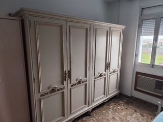 Conjunto de muebles de dormitorio que incluye un armario grande y dos mesitas. - Armario grande de madera con cuatro puertas y altillos. Gran capacidad - Dos mesitas a juego. - coqueta con tres cajones y puerta.