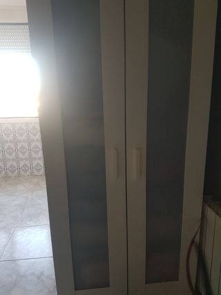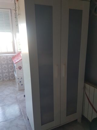 Armario de madera de color blanco de dos puertas en muy buenas condiciones,con signos de uso, pero ni afectan al mueble,ni se perciben, porque el armario esta intacto y muy buen cuidado,se entrega completamente vacio. El armario esta tal y como esta en la foto, no esta desmontado. El armario es de madera buena y resistente, no como los muebles de hoy en dia que son super fragiles y con un almacenamiento super grande, al ser tan grande te entra de todo. Se ayuda a desmontarlo si es necesario MEDIDAS: _ALTO:180cm. _ANCHO:80cm. _FONDO:51cm.