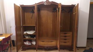 Armario ropero antiguo de 3 puertas en muy buen estado. Madera tallada a mano. Perfecto para decorar tienda, restaurante o para almacenaje. Con tiradores de bronce, valdas cambiables de altura a la izq., un cajón grande en medio y 4 cajones drcha., con barras para colgar perchas en los 3 compartimentos y dos grandes espejos enfrentados. También dispongo del resto del dormitorio a juego, si te interesa: cama, tocador y mesilla de noche. Fácil montaje/desmontaje.