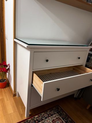 Cómoda de tres cajones con un diseño moderno y elegante. La tapa superior es de cristal, aportando un toque sofisticado. - Amplio espacio de almacenamiento. - Tiradores negros discretos.