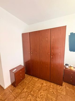 Conjunto de muebles de dormitorio que incluye un armario grande, un sinfonier y una mesita de noche. - Armario con puertas de espejo. - Sinfonier con varios cajones. - Diseño clásico y elegante. - Desmontaje por parte del comprador. -Armario mas de 2mts de alto y ancho, pedir medidas.