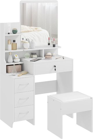 Este elegante set de maquillaje incluye un tocador, un taburete acolchado y un gran espejo, perfecto para tu rutina de belleza. Fabricado en resistente melamina de madera, ofrece 4 cajones y estantes para organizar cosméticos y joyas. Dimensiones del tocador: 80L x 38P x 143A cm; taburete: 40L x 30P x 40A cm; espejo: 52.5L x 54.5A cm. Capacidad de peso: 50 kg (tocador), 110 kg (taburete). Equipado con patas antideslizantes para proteger el suelo. Montaje necesario. Color: Blanco. Incluye: 1 tocador, 1 taburete, 1 manual de instrucciones.