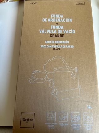 Set de fundas para guardar ropa y objetos de forma compacta. Incluye una funda de ordenación y otra con válvula de vacío. - Medidas: 100x45x15 cm. - Ideal para optimizar espacio en armarios y maletas. Dispongo de 2 unidades.