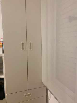 Sistema de vestidor modular Stolmen de Ikea. Incluye: - Estructura de metal y baldas blancas. - Postes de conexión: 10 ud (hasta 330) - Cajoneras: 3 ud (45x55x50) y 1 ud (45x110x50) - Baldas: 10 ud (55x50) y 3 ud (110x50) - Estantes zapatero: 4 ud (55x50) y 1 ud (110x50) - Barras para colgar: 3 ud (110) y 5 ud (55) - Suporte cinturones: 2 ud - Herrajes para acoplar componentes El precio incluye los 3 conjuntos mostrados en las fotos Podemos vender cada uno de los conjuntos por separado (consultar). No vendemos componentes sueltos.