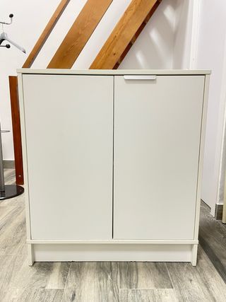 Mueble zapatero de Ikea con un diseño moderno y funcional. - Acabado en color blanco. - Fabricado en madera. - Dispone de varios compartimentos para organizar calzado. - Tiradores comprados aparte distintos de los originales. Más bonitos