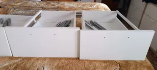 Conjunto de cuatro cajones del sistema Maximera de Ikea. Son de color blanco y están fabricados en madera. Para mueble de 40 cm de ancho Llevan de regalo frentes de cajón modelo ringhult alto brillo, que están en buen estado de uso por fuera. Los frentes se pueden cambiar siguiendo las instrucciones de desmontaje del cajón maximera. Sin tiradores. 1 cajón pequeño con frente de alto 10 cm, 13€ 1 cajón pequeño con frente de alto 20 cm, 13€ 1 cajón mediano con frente de alto 20 cm, 18€ 1 cajón mediano con frente de alto 20 cm, 16€ (le falta un embellecedor del lateral). No hago envíos. Entrega en mano y cobro en efectivo.