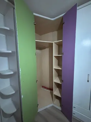 Armario esquinero de dos puertas correderas plegables. 🦾 Es robusto y de calidad. No es un armario de Ikea. 📏 Medidas incluidas en la foto. El fondo en ambos lados es de 0,50m. Llega hasta el techo. 👗Gran capacidad. Con buena distribución interior para colgar y almacenar en baldas. ✨ Está en perfecto estado. Se vende por falta de espacio.