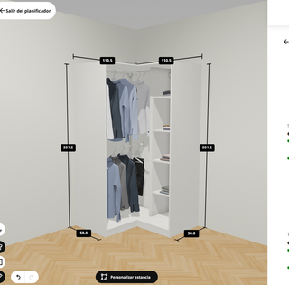Armario esquinero con un diseño elegante que se adapta a cualquier espacio. No tiene más de un año. Está diseñado por mí a través de Ikea. Precio negociable. Características: - Puertas con acabado en beige y blanco. - Paneles de cristal integrados. - Fabricado en madera de calidad.