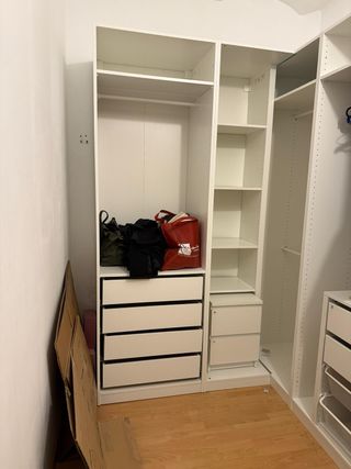 Armario modular de Ikea. Módulo esquina 4 baldas, blanco, 53x58x236 cm Estructura armario, blanco, 75x58x236 cm Estructura armario, blanco, 100x58x236 cm Viene con baldas, cajones y bisagras. El armario lo entregaría desmontado, como se ve es un armario esquinero.
