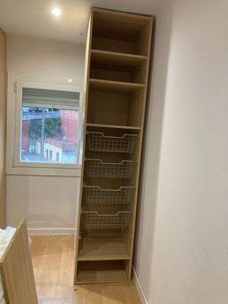 Armario alto de madera con compartimentos y cajones. - Medidas: 50cm ancho x 58cm fondo x 236cm alto. - Diseño de madera clara. - Incluye estantes y cajones para organización. - Incluye bandeja extraíble. *El armario de la izquierda que se ve en la cuarta foto no está incluido, pero también está a la venta. Se aceptan ofertas por el conjunto.