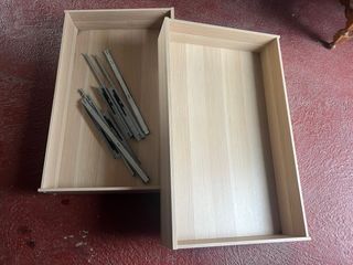 Conjunto de 2 cajones de madera para armario PAX de IKEA. Listos para montar. 1 de ellos en perfecto estado, otro un poco descuadrado. - Cajones de madera clara. - Guías metálicas incluidas. (No tornillos) MEDIDAS: 57cm x 93cm x 16cm