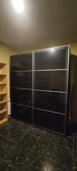 Estupendo armario ikea de cuatro modulos con todo tipo de almacenaje, tanto baldas para colgar ropa, estantes, cajonera compuesta de 3 cajones de gran capacidad, zona de pantalonero, almacenaje de zapatos, y puertas correderas de paneles de vidrio con estampado. Todo el armario tiene luz led. Un lateral de un modulo esta dañado por agua por lo que habría que comprar uno igual. Se conserva en buen estado. Precio negociable