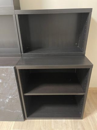 Combinación de muebles Besta nuevo sin usar (las puertas están aún en su embalaje), que incluye: 2 estructuras Besta 60x40x64 cm en color Negro-Marrón 2 puertas Bergsviken efecto marmol 60x64 cm 2 baldas 56x36 cm en color Negro - Marrón 3 estructuras Besta 60x20x38 cm en color Negro - Marrón 3 puertas Bergsviken efecto marmol 60x38 cm 5 Packs de 2 Bisagras a presión para Besta #Estanterías #Almacenaje #Muebles de salón