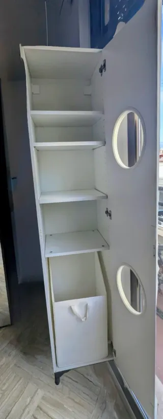 Armario estrecho de Ikea, perfecto para lavandería o almacenamiento. Precio EUR 50. - Diseño moderno con puertas frontales. - Incluyo una cesta de tela por armario y algunas baldas de almacenamiento. - Acabado en color blanco. No hago envíos.