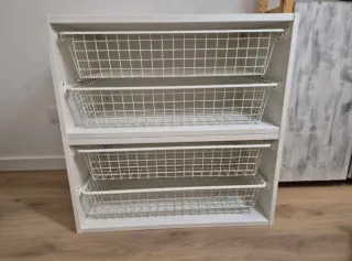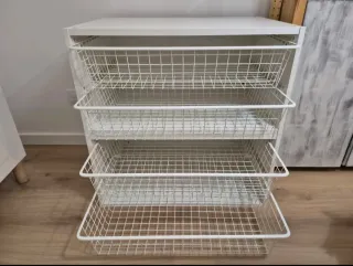Práctica cajonera modular de Ikea con cestas. 4 cestas. - Estructura de madera y cestas metálicas. - Color blanco. - Diseño de cestas abiertas. En perfecto estado. Perfecta para el interior del armario. El tamaño es de 80cms de ancho, 55cms de profundidad y 80cms de alto. Ya montado.