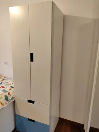 Armario modular de Ikea, combina los sistemas SMÅSTAD y PLATSA. Ideal para organizar ropa y otros objetos. - Puertas blancas - Cajones inferiores en color azul y blanco. Falta la barra, y tiene unos pequeños roces, en la foto se ven. Puedo mandar más fotos. De ahí el precio.