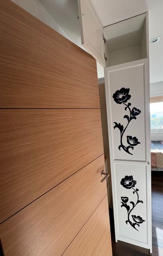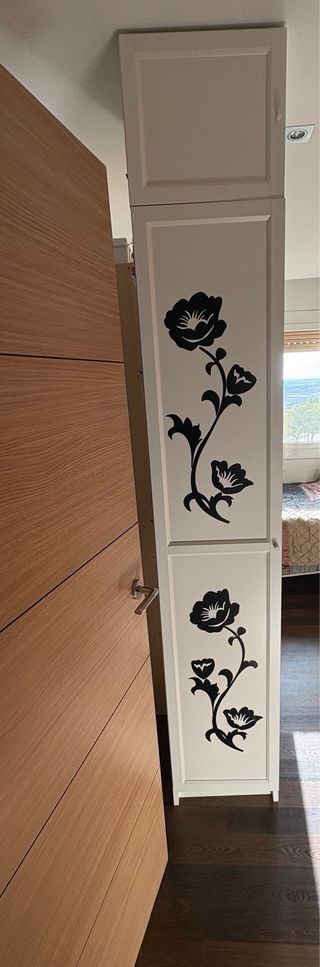 Armario de la marca Ikea con diseños florales ( pegatinas puestas por dueño, se pueden quitar ) - Acabado blanco. -Medidas de 40X42xX237cm . La parte de arriba se puede desmontar y dejar el armario a 202cm. Muy ligero y cómodo . En mi ocasión le añadia varios ganchos ( para bolsos, etc)por fuera y se hace funcional.