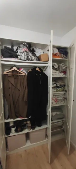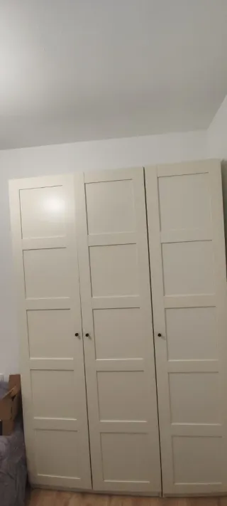 Vendo armario vestidor IKEA en color blanco, de gran capacidad y en muy buen estado. Diseño moderno y elegante, ideal para dormitorio o vestidor. Dispone de puertas correderas, perfectas para ahorrar espacio y facilitar el acceso. Distribución interior muy completa: -Varias baldas regulables para ropa doblada o cajas. -Zona de colgar con barra resistente para camisas, chaquetas y abrigos. -Cajones interiores amplios para ropa interior y accesorios. -Bandejas extraíbles tipo pantalonera. -Espacio superior para almacenaje de temporada. -Armario robusto y estable, bien cuidado, sin golpes ni desperfectos importantes. Valor casi 1000€