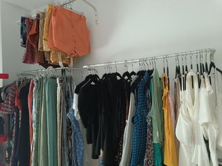 Vendo organizador de armario vertical de tela. Es perfecto para guardar ropa u otros objetos. - Tiene cuatro baldas. - Se cuelga fácilmente con una percha. - Está en buen estado.